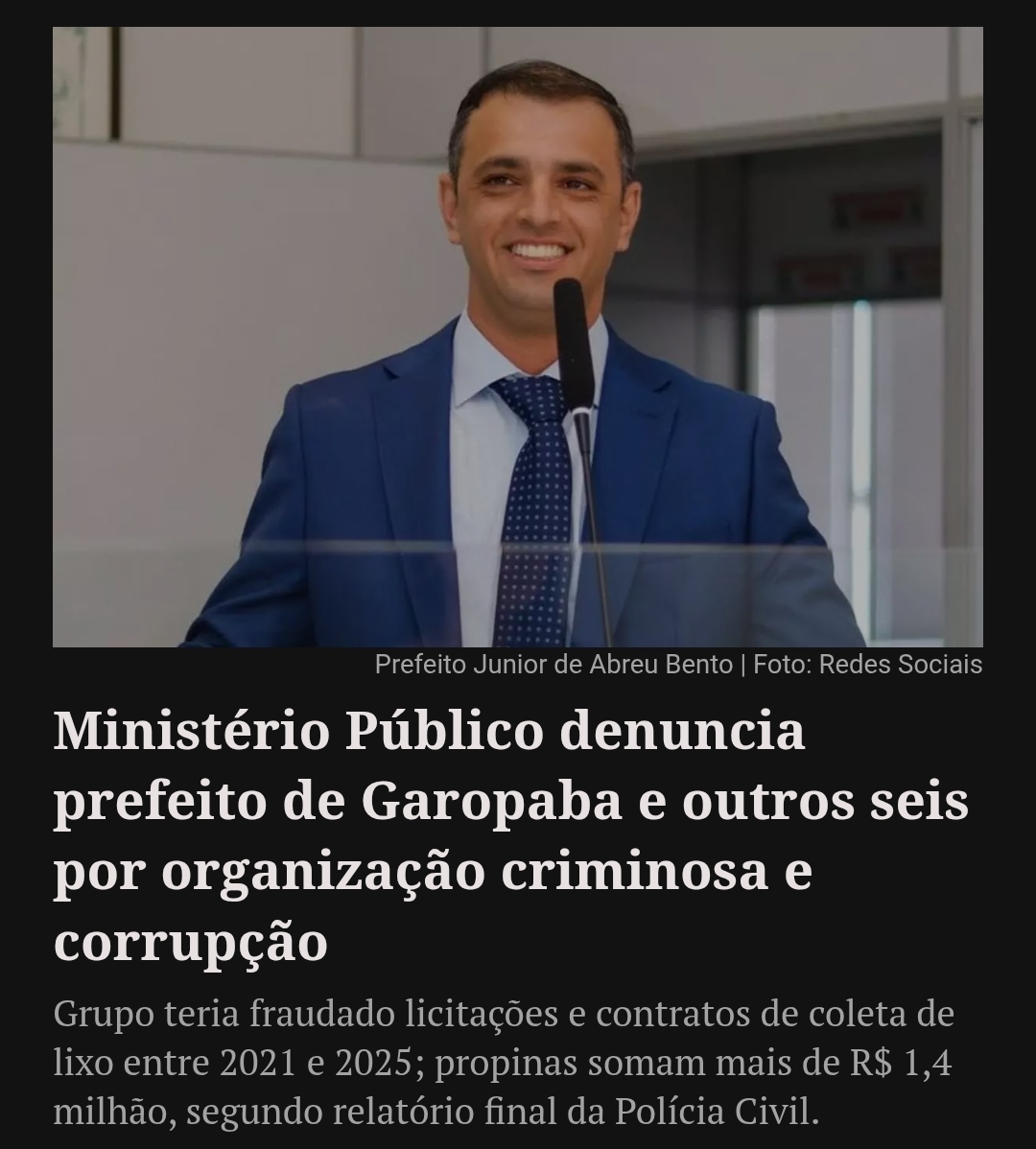 O Ministério Público de Santa Catarina denunciou o prefeito de Garopaba, Junior de Abreu Bento, e outros seis por organização criminosa e corrupção, acusando-os de fraudar licitações e contratos de coleta de lixo entre 2021 e 2025